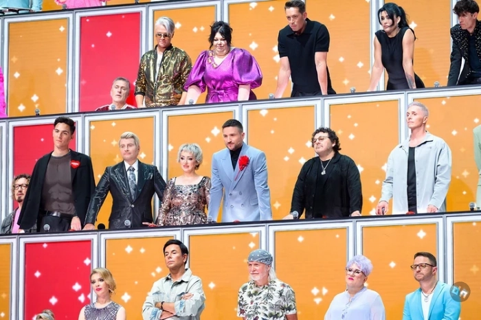 Лазарев на стене с сотней телешоу «Ну-ка, все вместе!». Фото: кадр телеканала «Россия».