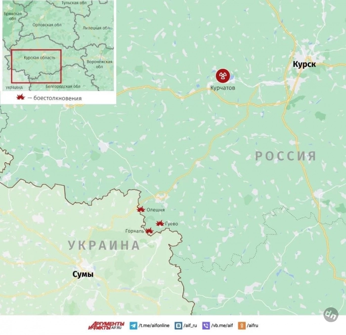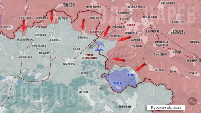 В Курском приграничье бои идут на двух оставшихся участках у границы, в районах Олешни и Гуево. У Олешни наши продвигаются в тяжёлыми боями. В районе Гуево ожесточённые бои идут южнее села вдоль дороги к хутору Горналь и Горнальскому Свято-Николаевскому монастырю.