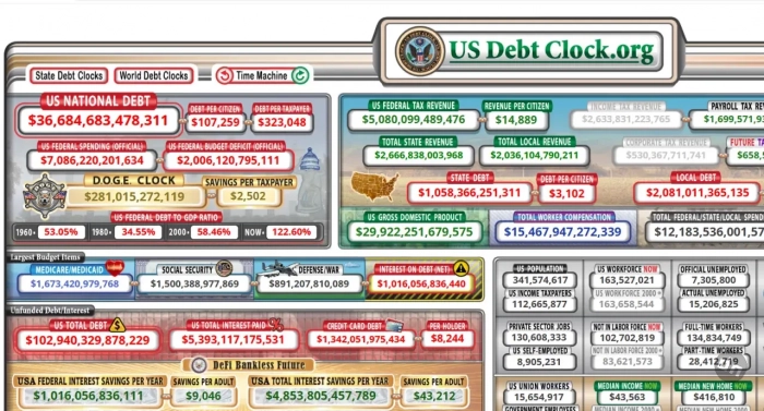 Суммарный долг США при этом продолжает активно расти, ничуть не снизив своей скорости. На текущий момент его объёмы составляют почти 36,7 трлн долларов.