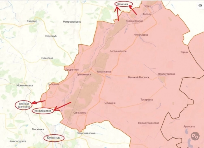 Кроме того, сообщается об успехах армии России у Кондрашовки и Малой Шапковки, где большая часть первого села уже под нами, за вторую идут бои. Значение посёлков трудно переоценить. Их освобождение позволит перерезать стратегическую дорогу Купянск - Большой Бурлук.