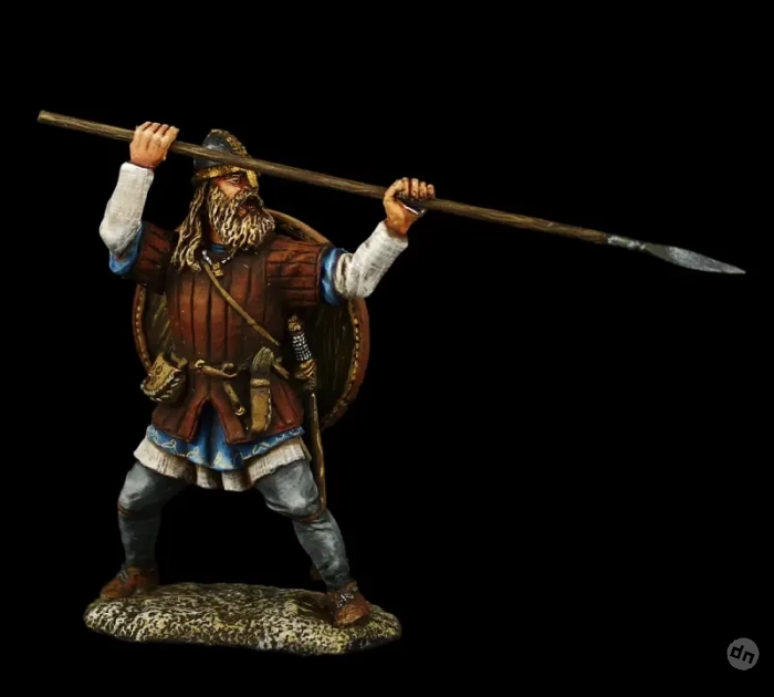 Викинг с копьем, одетый в кожаную «стеганку», IX-X вв. Изображение извилистого креста на щите было популярным мотивом среди северян. Производители: Silver Dream Studio и Miles Publius