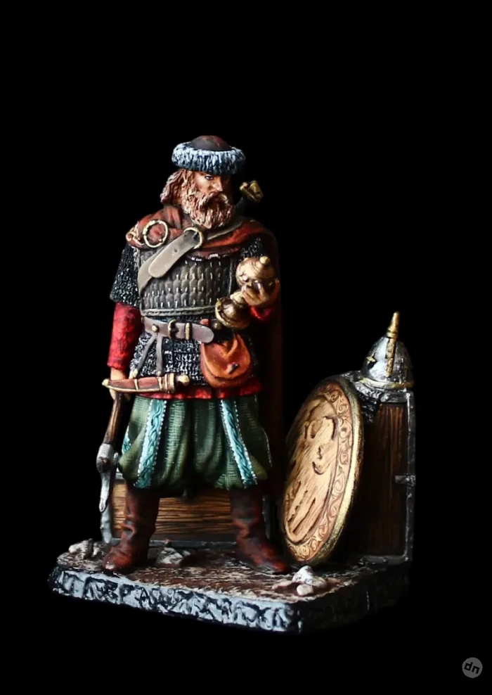Возможно, что именно так выглядел легендарный Рюрик, ставший в землях славян основателем династии Рюриковичей. На вид типичный викинг, норманн. Одет в кольчугу, а в руках у него топор – излюбленное оружие «северных людей» и шлем с полумаской, склепанный из четырех сегментов. Производители: Silver Dream Studio и «Серебряная Ладья».