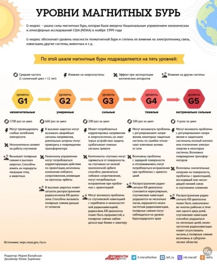 Магнитные бури - это резкие возмущения геомагнитного поля Земли, которые длятся от нескольких часов до нескольких суток. Ученые оценивают магнитные бури по 10-балльной шкале. Штормы до пяти баллов являются незначительными. Более сильные возмущения классифицируют по шкале от G1 до G5.