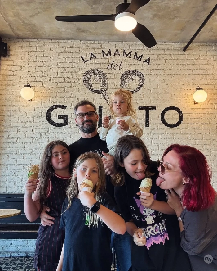 На снимке 12-летний Ноа, 11-летний Бодхи и восьмилетний Джорни запечатлены в кафе с отцом за поеданием мороженого. Грин держит на руках их с Бёрджесс двухлетнего первенца Зейна.