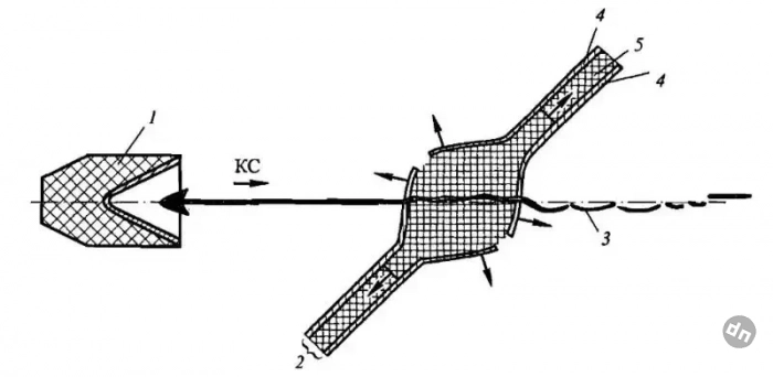 Действие NERA по кумулятивной струе. 1 – кумулятивный заряд, 2 – блок из металлических листов и инертного наполнителя, 3 – повреждённая кумулятивная струя, 4 – металлические пластины, 5 – инертный наполнитель