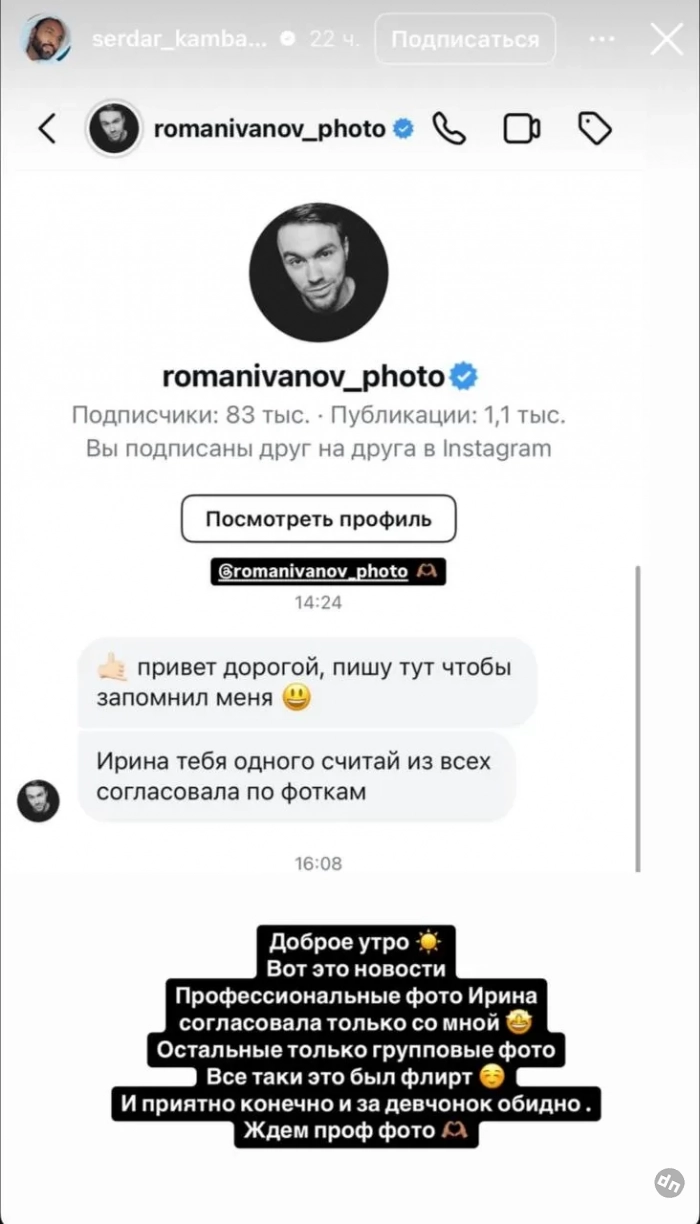 Об этом Камбаров написал в своём инстаграме*, прикрепив скриншот сообщения от свадебного фотографа Романа Иванова. В нём Иванов написал, что, по его информации, супермодель согласовала профессиональные фотографии с мероприятия только с Сердаром. "Доброе утро, вот это новости! Всё-таки это был флирт. И приятно, конечно, и за девочек обидно. Ждём профессиональные фото", — подписал звёздный визажист сторис.