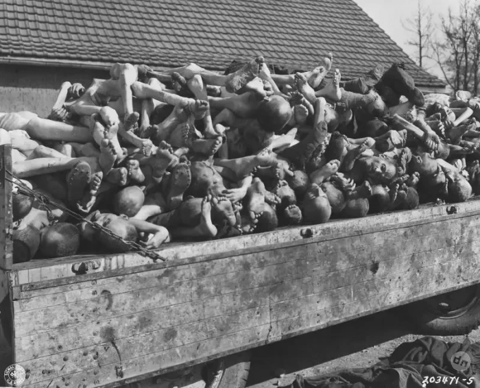 Трупы узников концентрационного лагеря Бухенвальд, приготовленные для сжигания в крематории, в кузове прицепа. Апрель 1945