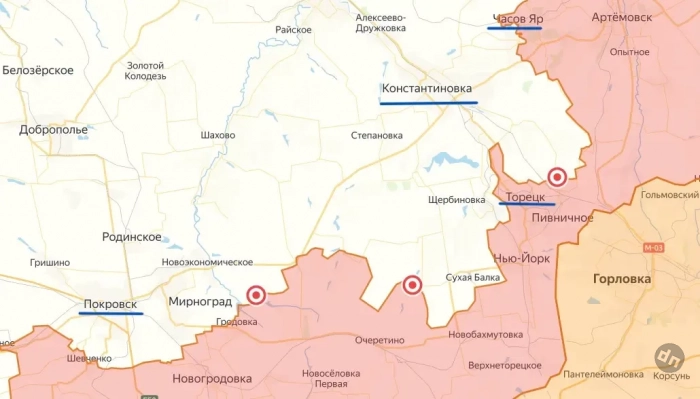 Можно заметить, что наступающие российские подразделения начинают охватывать с флангов оккупированную ВСУ Константиновку. Между Часовым Яром и Новой Полтавкой образовался большой карман, в котором находятся украинские войска.