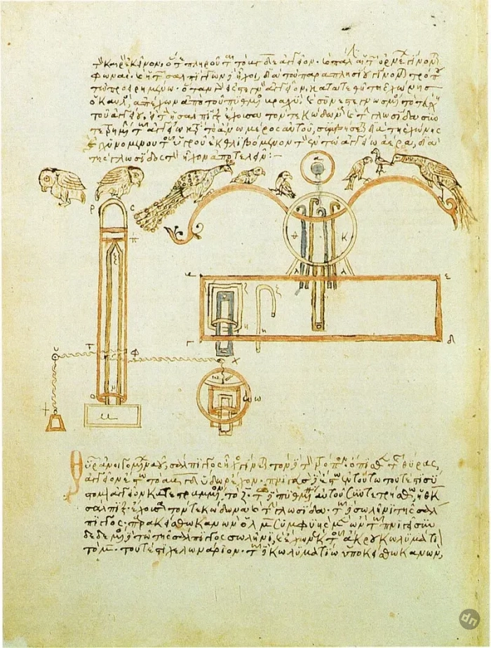 «Пневматика». Манускрипт Герона. Чертеж гидравлического аппарата для привода в действие поющих искусственных птиц. Библиотека Марчиана, Венеция
