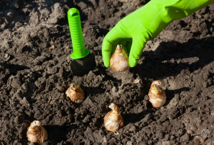 Расстояние между луковицами — около 15 см, между рядами — до 50 см. На дно каждой лунки желательно насыпать немного песка для дренажа. После посадки землю аккуратно утрамбуйте и полейте.
