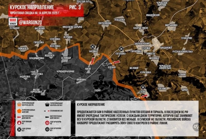 «Курская область. Продолжаются бои в районе населенных пунктов Олешня и Горналь. В последнем ВС РФ имеют очередные тактические успехи. С каждым днем территория, которую еще занимают ВСУ в Курской области, становится все меньше. В Сумской области российские войска, наоборот, продолжают расширять зону своего контроля в районе Локни", - проинформировал Telegram-канал.