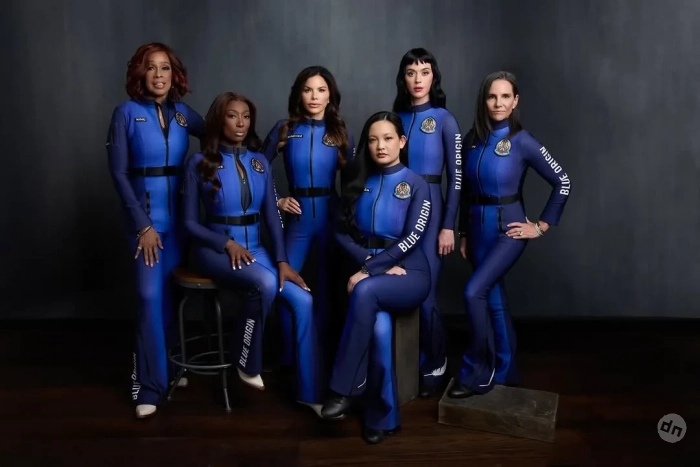 Лорен Санчес, Аманда Нгуен, Кэти Перри, Гейл Кинг, Аиша Боу, Кериэнн ФлиннЛорен СанчесКэти ПерриКэти Перри и Лорен СанчесЛорен СанчесЭта миссия с полностью женским экипажем станет первой с момента одиночного полёта Валентины Терешковой в космос в 1963 году и продлится 11 минут. Дизайн синих костюмов для полёта разрабатывала Лорен Санчес вместе с креативными директорами Oscar de la Renta Фернандо Гарсией и Лорой Ким. Также для полёта команда выбрала нижнее бельё бренда Ким Кардашьян Skims. 55-летняя Санчес ранее заявляла, что планирует лететь с макияжем и наращёнными ресницами.