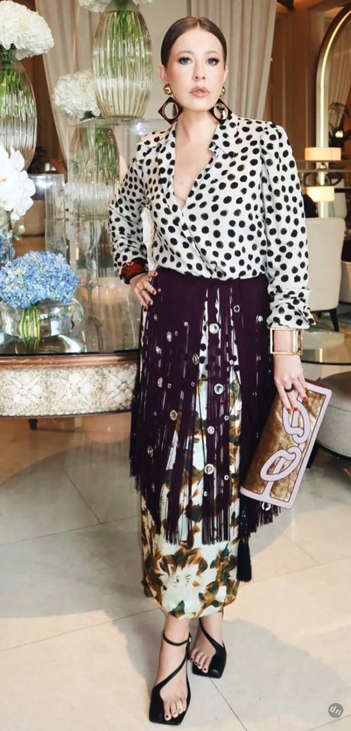 Ксения иронично охарактеризовала свой стиль, как «с легкой *******». Что ж, с ней трудно не согласиться. Особенно глядя на эти босоножки, которые я бы назвала «пальцы наружу». Оригинальный дизайн поймут единицы. Да и пальчики во время ходьбы, скорее всего, расползаются. Эксцентричные босоножки Собчак сочетала с пестрой юбкой, блузой в горох от Dries Van Noten и дополнила поясом Prada. Жаль, что бренд незабываемой обуви журналистка не указала.
