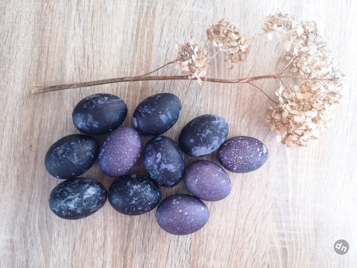 Погрузите яйца в отвар и оставьте на ночь. Получатся крашенки в красивом темно-синем цвете.
