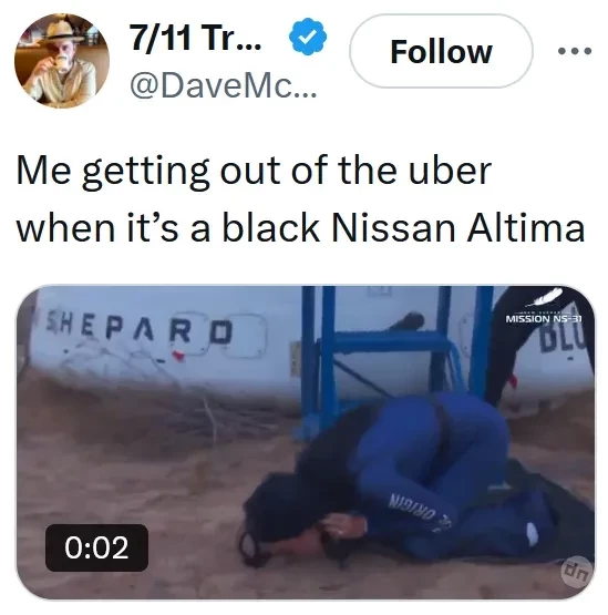 https://t.me/spletnik2006/28729Полёт миссии New Shepard NS-31Экипаж миссии New Shepard NS-31 после приземленияОливия Уайлд опубликовала в инстаграме* кадр из трансляции полёта, написав: "Полагаю, несколько хороших мемов стоят миллиарда долларов". Эми Шумер спародировала Кэти Перри, пошутив, что тоже получила приглашение в полёт.