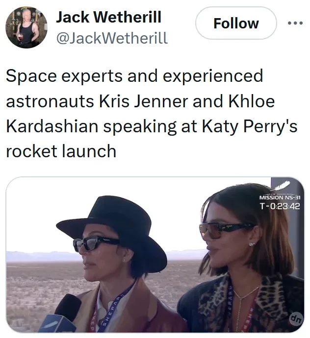В сети массово критикуют полёт в космос ракеты Джеффа Безоса с женским экипажем — в том числе с невестой миллиардера Лорен Санчес и певицей Кэти Перри в составе. К хейтерам присоединилась модель Эмили Ратаковски, которая заявила о бессмысленности этого полёта и его вреде экологии. Стендап-комик и актриса Эми Шумер, в свою очередь записала ролик, в котором спародировала Перри.