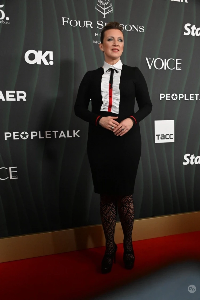 Мария Захарова дополнила строгий верх эффектными шпильками.
