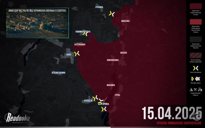 На Краснолиманском направлении ВС РФ развивают наступление на Новомихайловку. Новое фактически находится в оперативном окружении - с трёх сторон дороги взяты под физический контроль, с запада - под огневой. Южнее Ямполовки продолжаются атаки на Торское.