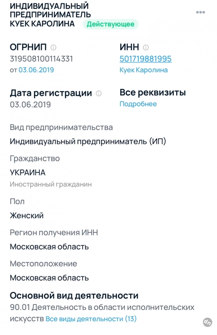У Каролины Куек в Подмосковье зарегистрировано ИП.