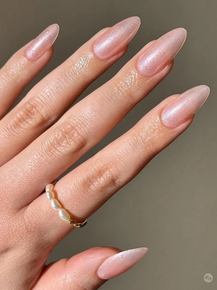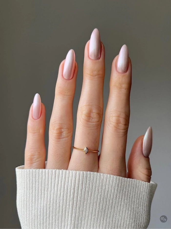 Ногти, мерцающие как морская раковина, — тренд, неподвластный времени. Перламутровые переливы добавляют глубины и утончённости. Если под рукой нет нужного лака — используйте мерцающие тени, закрепив их прозрачным топом. Получится не хуже, чем в салоне.