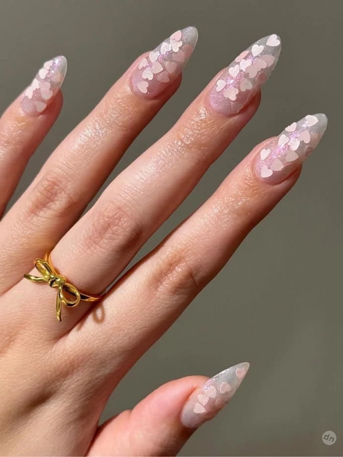 Добавьте в маникюр немного символизма — миниатюрные сердечки, нарисованные от руки или нанесённые с помощью стемпинга, придадут образу наивной нежности. Для блеска можно использовать пигмент или микроблеск. Такой дизайн точно не останется незамеченным.