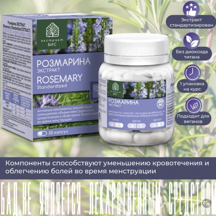 Розмарина Экстракт от ВИС — это умная и деликатная поддержка женского организма в самый чувствительный период месяца. Сертифицированный экстракт розмарина с высокой концентрацией розмариновой кислоты действует как природный спазмолитик и антиоксидант: расслабляет гладкую мускулатуру, снижает воспаление и помогает уменьшить менструальные боли. Витамин Е и рутин усиливают эффект, смягчая симптомы дисменореи и защищая клетки от окислительного стресса. Работает мягко, но уверенно — именно так, как нужно.