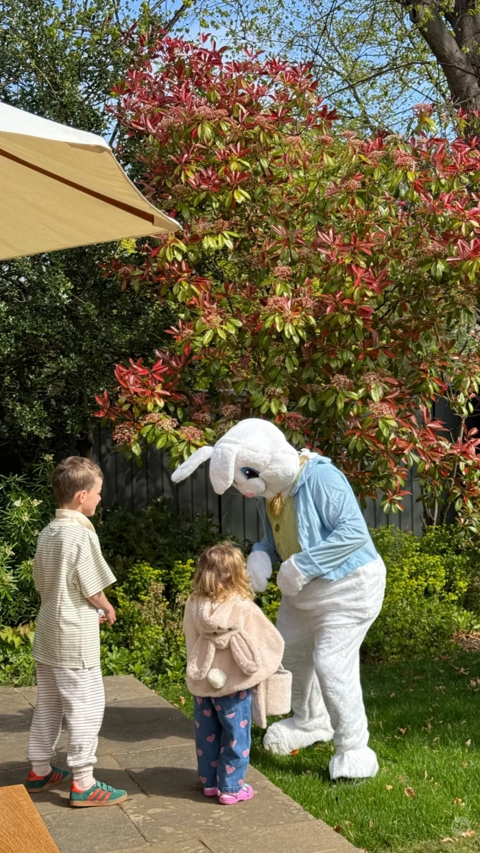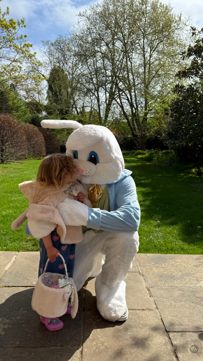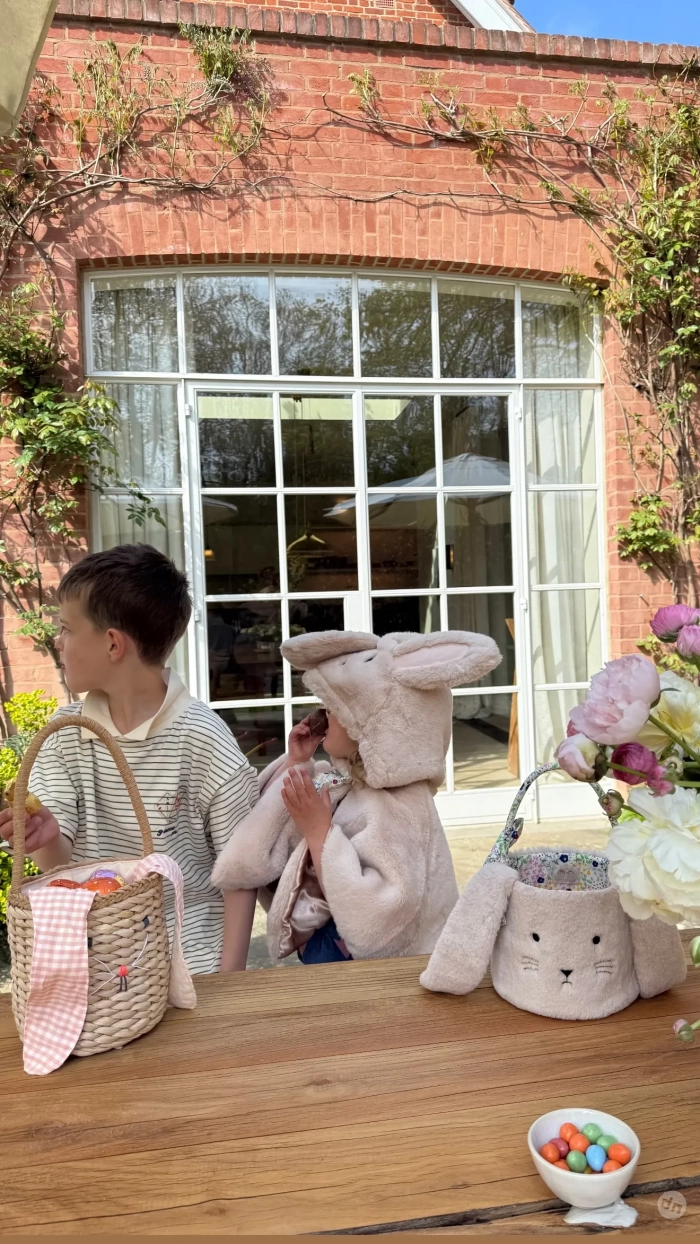 На фотографиях можно увидеть, как дети, трёхлетняя Изабелла и семилетний Джек, празднуют Пасху. На одном из снимков они общаются с аниматором в костюме кролика, а на другом уже сам аниматор обнимает Изабеллу. Также модель добавила фотографию, где дети едят сладости, которые им подарили.