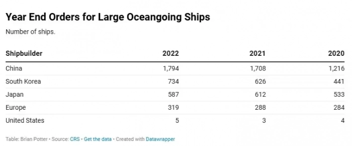 В настоящее время Соединенные Штаты и Китай имеют относительное равенство в общем объеме производства. Однако в сфере судостроения Китай занимает 46,59% мирового рынка и является крупнейшим производителем, на втором месте Южная Корея с 29,24%, а на третьем — Япония с 17,25%. Доля Соединенных Штатов составляет 0,13%.