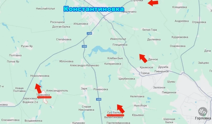 К Константиновке наши войска подходят и со стороны Торецка (Дзержинска). Там бои идут в районе посёлка Дылеевка, от которого до Константиновки менее 10 км. Севернее посёлка находится и одноимённое село (тоже Дылеевка).