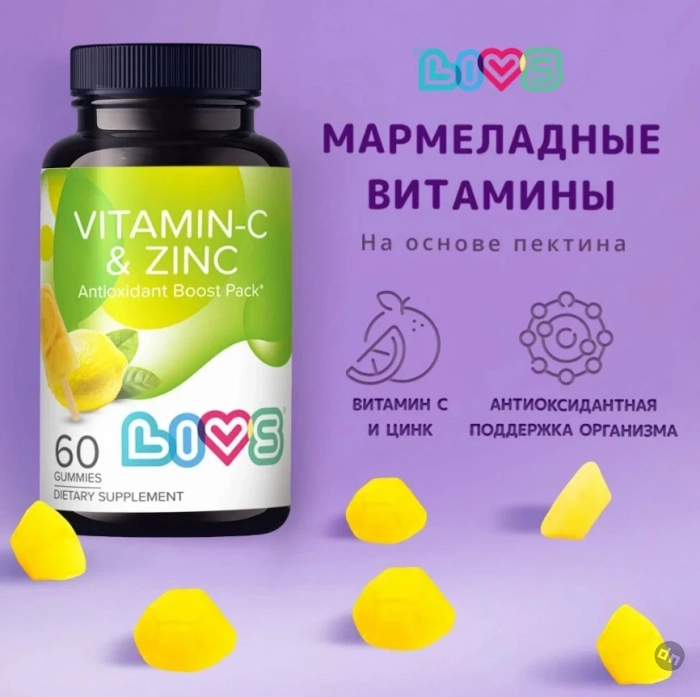 LIVS Витаминный комплекс с витамином C и цинком — это удобная и эффективная добавка в виде жевательных пастилок со вкусом лимонного мороженого. В составе — 125 мг витамина C и 25 мг цинка, которые способствуют поддержке иммунной системы, улучшению состояния кожи, предотвращению выпадения волос и нормализации работы сальных желез. Комплекс из натуральных ингредиентов (пектин, экстракт куркумы) не содержит аллергенов и консервантов, что делает его безопасным и приятным для ежедневного употребления. Продукт идеален для взрослых, ищущих способ повысить иммунитет и общее самочувствие.