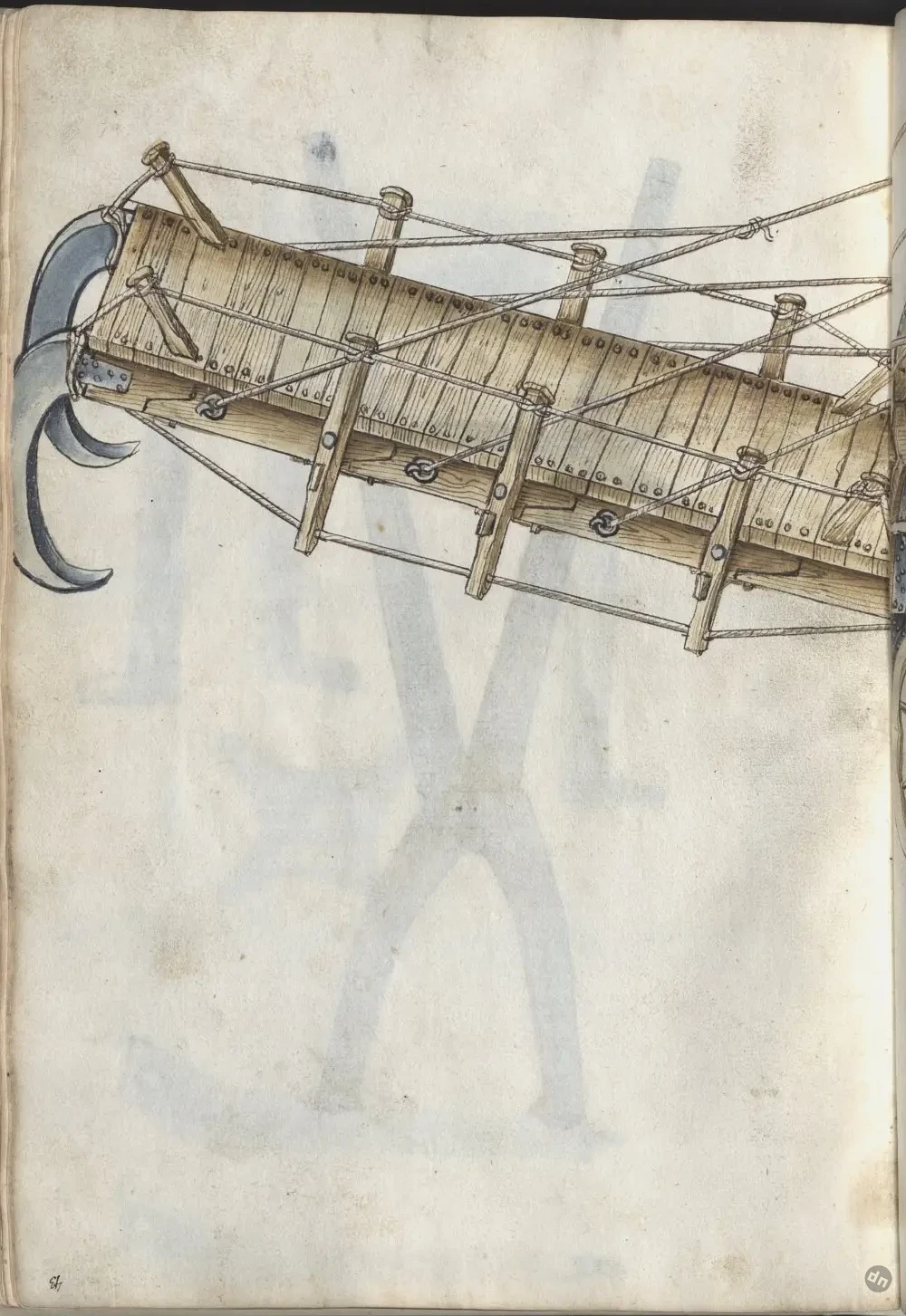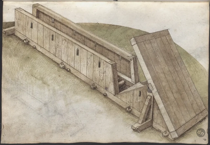 Проект «дешевых укреплений» для замка. Обычная земля, бревна и колья из леса вполне, по мнению Мартина Мерца, могли послужить для создания оборонительных сооружений там, где они отсутствовали. «Книга фейерверков». Мартин Мерц. Северная Бавария/Франкония, I: 2-я половина XV века; 1473 г. Баварская государственная библиотека, Мюнхен