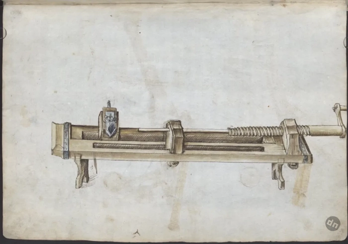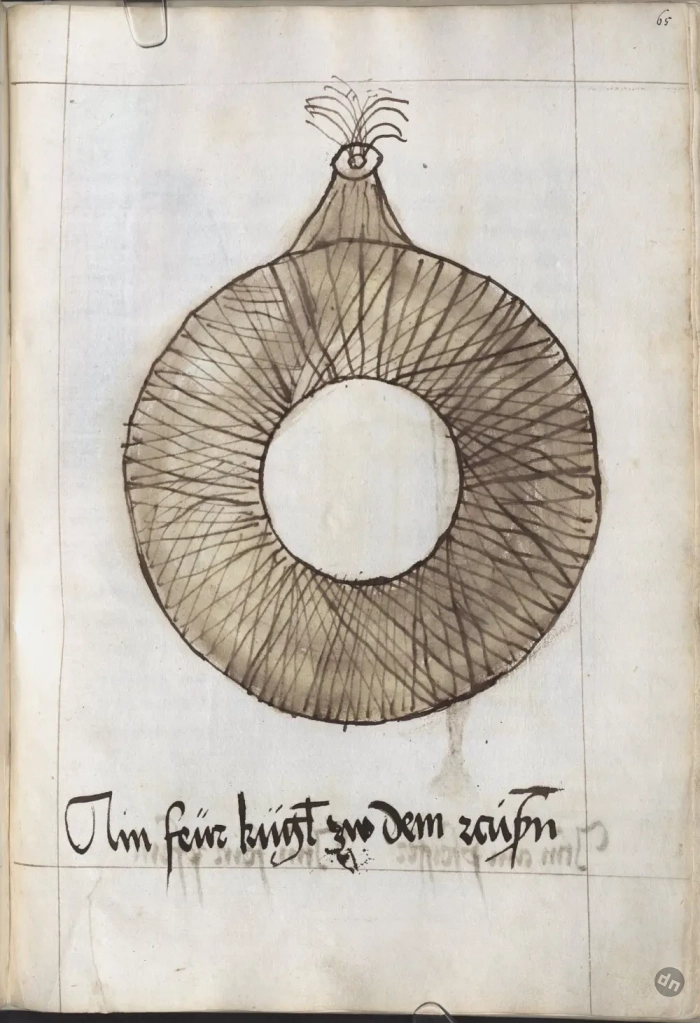 О самом авторе известно, что в 1460 году Мартин Мерц поступил на службу в качестве оружейника ко двору курфюрста Пфальца Фридриху I Победоносному (имел он и прозвище «Злой Фриц», и, видно, недаром), а спустя девять лет смог сделаться главным оружейником его армии. Когда Фридрих I умер в 1476 году, Мерц продолжил свою службу при курфюрсте Филиппе. А еще Мартин Мерц работал с металлом: усовершенствовал ряд составных частей моделей пистолетов, с успехом отливал орудийные стволы и одновременно трудился над своей книгой «Feuerwerksbuch» («Книгой фейерверков»). Других книг он не написал, но зато в этой уровень своего времени отразил очень четко, указав вдобавок еще и на ряд важных принципов конструирования порохового оружия. Итак, будем перелистывать самые интересные страницы этой книги и рассматривать то, что на них изображено.
