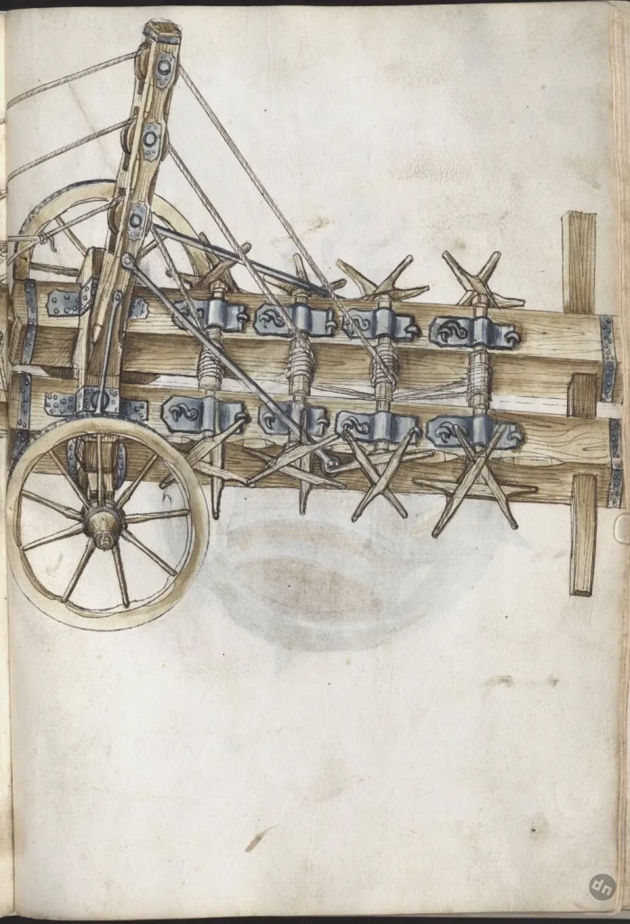 Сколько стволов вот у этого забавного орудия? По подсчетам выходит не меньше 11, причем сгруппированы все стволы в три группы, и у каждой своя система наведения. То есть такая вот установка могла дать три выстрела с разным прицелом и на разные дистанции. Причем центральная группа стволов — это, видимо, вообще рибодекин или «орган», то есть многоствольное орудие с последовательным («цепным») воспламенением