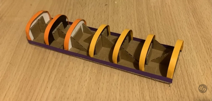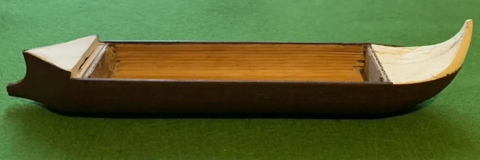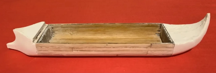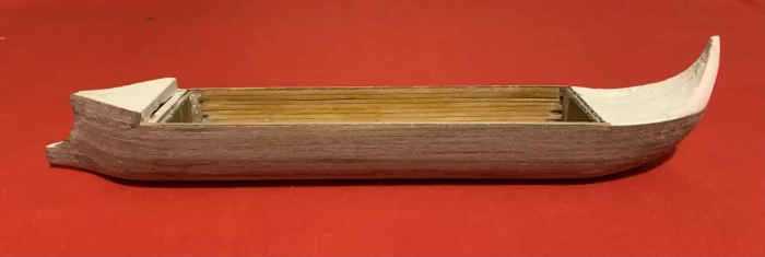 Изображённая на нашем фото деталь может быть сделана из чего угодно, включая упаковочный картон и нарезанные полоски плотной бумаги. Снаружи остов оклеивается палочками-мешалками для кофе в два ряда с использованием клея ПВА. Затем все внутренние крепления кроме концевых переборок удаляются, после чего корпус изнутри оклеивается полосками шпона шириной 2 мм.