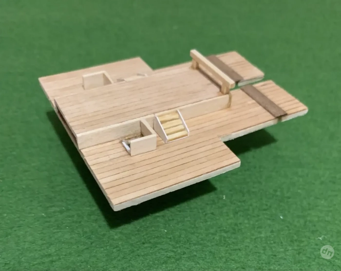 Вид сверху. Подставка – кусок ДСП, оклеенный полосками шпона. Палубный настил покрыт лаком. Перила и части корпуса – акриловая краска красного и синего цвета