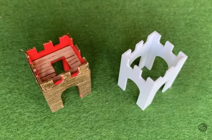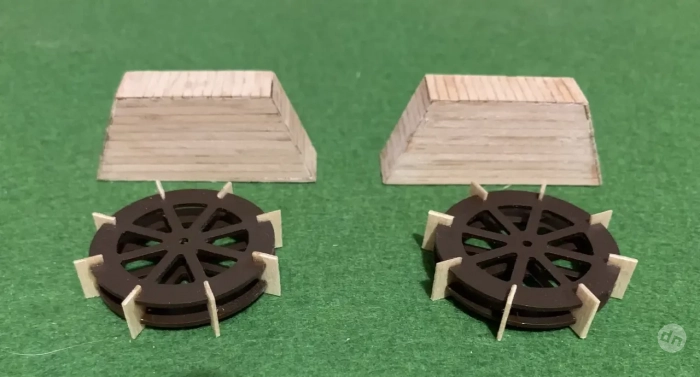 Детали боевых башен, так же как и гребные колеса, вырезаны из полистирола толщиной 1 мм на стенке с ЧПУ. Однако их совсем нетрудно вырезать и из тонкого картона, вплоть до поздравительных открыток и упаковок из-под чая! На готовых башнях полосками шпона имитируют бронзовые листы…