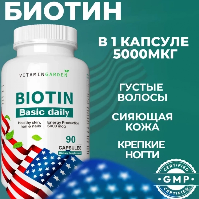 Витамины BIOTIN от Vitamin Garden — это идеальный комплекс для борьбы с выпадением волос и улучшения состояния кожи и ногтей. Содержат биотин (витамин В7), который активно способствует укреплению волосяных фолликулов и улучшению обменных процессов в организме. Благодаря высокой дозировке (5000 мкг) и уникальной формуле для лучшего усвоения, эти витамины быстро решают проблему ломкости и выпадения волос, попадая в топ бадов для волос. Идеально подходит для людей с активным образом жизни.