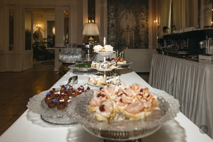 В общем, банкет в честь жениха и невесты был нестандартный. Даже подачу блюд организовали не как принято. Официанты в белых перчатках сперва угощали гостей закусками и приветственными коктейлем, а также шампанским. В основном рыба и паштеты. Затем был ужин.