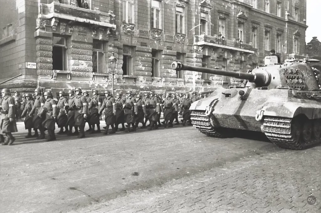 Немецкий танк и подразделение Скрещенных стрел на улице Будапешта