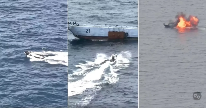 ВМС Франции в рамках развития морских автономных и роботизированных систем провели эксперимент: дистанционно управляемый гидроцикл с боезарядом был запущен в сторону списанного десантного катера типа CTM, что привело к подрыву судна. Соответствующие кадры показаны в сети.