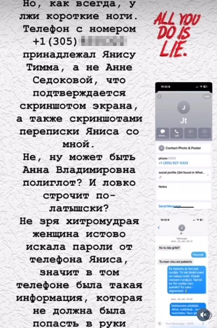 Отец баскетболиста добавил, что Анна сообщила следствию и о том, что у бывшего мужа якобы находились три айфона, которые принадлежат ей. Однако Райтис опубликовал скрин переписки одного из телефонов на латышском языке, которого Седокова не знает. Мужчина уверен, что смартфоны, которые сейчас находятся у следователей, были нужны певице из-за информации в них, которая может повлиять на дальнейший ход событий. Также Райтис отметил, что Анна интересовалась у мамы Яниса на счет паролей от телефонов.