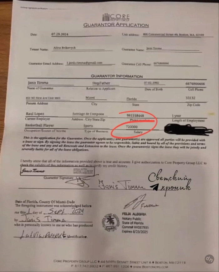 А именно, Райтис Тимма обнародовал договор аренды апартаментов в США для старшей дочери Анны, Алины Белькевич, в котором поручителем и гарантом значится “отчим Янис Тимма”. “Поручителем и финансовым гарантом по нему, как вы думаете, кто выступал? Седокова? Да что вы. Янис Тимма. Да-да, тот самый безработный бездельник, который жил за ее счет. Каким-то чудесным образом у безработного не баскетболиста имелась финансово-кредитная история, подтверждающая получение ежемесячного дохода от спортивного баскетбольного клуба”, — рассказал Райтис.