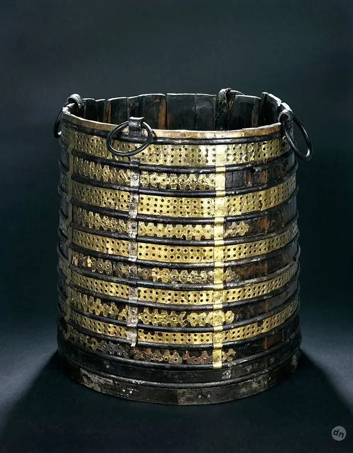 Интересно, что во время раскопок в Осеберге было найдено достаточно много предметов для кухни. Возможно, это были символы власти, потому что предметы эти явно не рядовые. То есть элита демонстрировала своё могущество, устраивая большие пиры и жертвоприношения. Археологи обнаружили два железных горшка разного размера, один с треногой. Железные горшки могли также быть особым символом статуса и власти. Среди найденной утвари были три венчика, которыми что-то взбивали, пять ковшей разного размера, два кухонных топора, железный нож и сито для процеживания молока. Посуда состояла из трёх небольших корыт, нескольких подносов и деревянной миски. Нашли и жернов для помола муки, состоящий из двух круглых камней с отверстием посередине, и с нетронутой деревянной рукояткой. Среди находок было несколько вёдер, включая и очень необычного вида «ведро Будды». Название это происходит от двух фигур, похожих на Будду, на его ручке. Вероятно, оно было привезено из Ирландии и может быть доказательством расширения викингами ареалов грабежа и торговли.