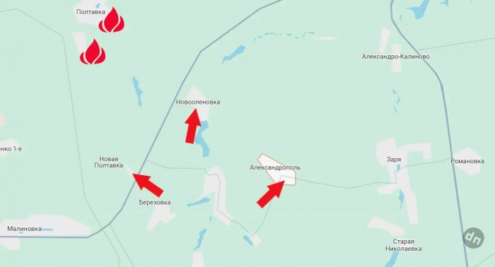 К настоящему моменту противник под ударами ВС РФ потерял контроль над позициями на южной окраине Александрополя. Таким образом российские подразделения увеличивают зону контроля в географическом треугольнике Новоеленовка – Александрополь - Новая Полтавка.