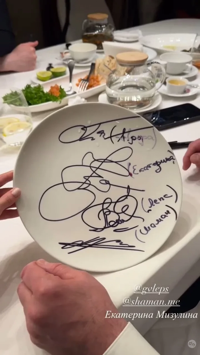 В своём телеграм-канале 40-летняя Мизулина опубликовала фотографию с тарелкой, на которой можно рассмотреть автографы всех четырёх. Позже такую же фотографию выложила Аврора Киба в своём инстаграме*: на ней отчётливо видно, что они находятся в ресторане.
