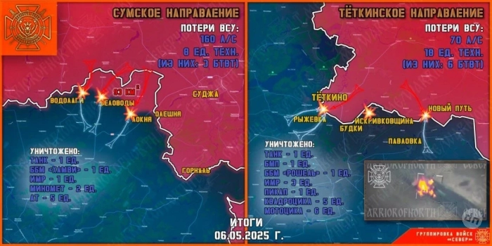Telegram-канал "Северный ветер" информирует о том, что 6 мая группировка войск "Север" уничтожала передовые, инженерные и штурмовые подразделения противника на Тёткинском и Глушковском направлениях.