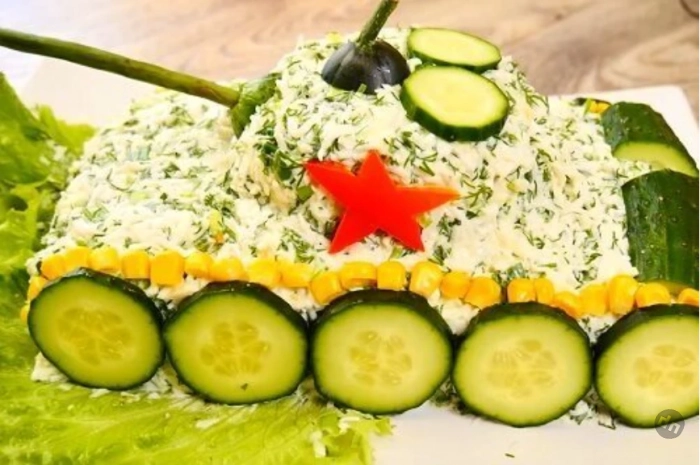 Еще один креативный способ украсить салат к 9 мая — это использовать военную тематику. Для создания салата «Танк» на основе классического «Оливье» вам понадобятся: