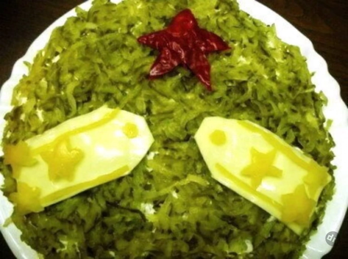 Простой салат можно преобразить, добавив символы Победы — звезду и георгиевскую ленту.