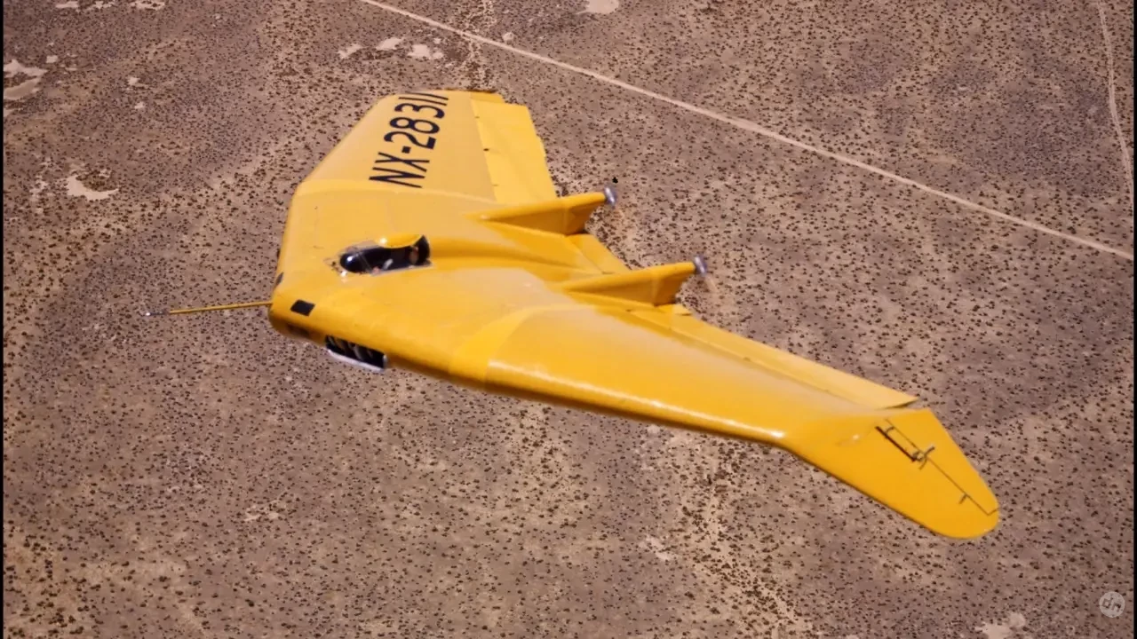 Окрашенный в желтый самолет Джека Нортропа N-1M, доказывающий, что конструкция крыла управляема, и данные, собранные во время этих испытательных полетов, были использованы при проектировании будущих летающих крыльев, таких как N-9M и бомбардировщик XB-35. Обратите внимание, что законцовки крыла направлены вниз, угол вручную регулировался на земле для проверки устойчивости планера.
