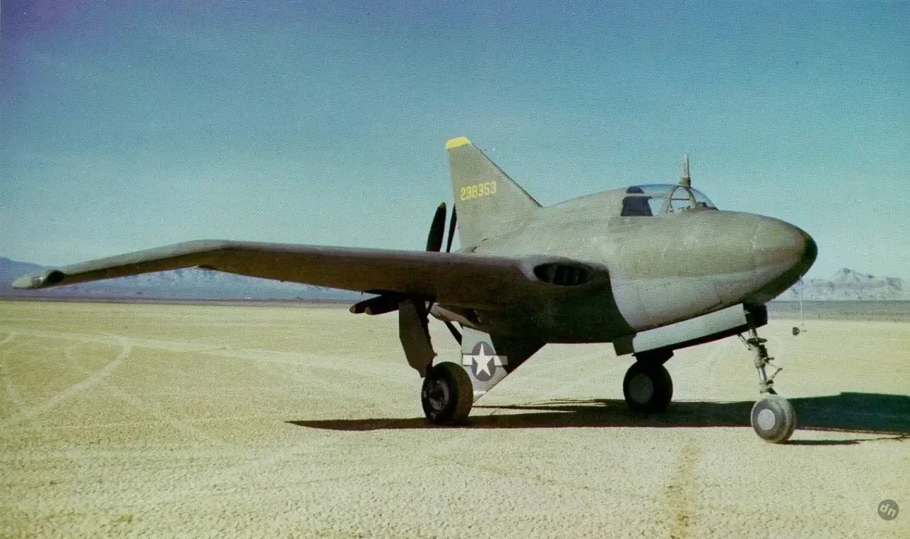 Второй экспериментальный прототип Northrop XP-56 Black Bullet, окрашенный в стандартные армейские цвета того времени. Обратите внимание на свисающие законцовки крыла, толкающие винты противоположного вращения и воздухозаборники крыла, подающие воздух к радиальному поршневому двигателю воздушного охлаждения, расположенному позади пилота в фюзеляже.